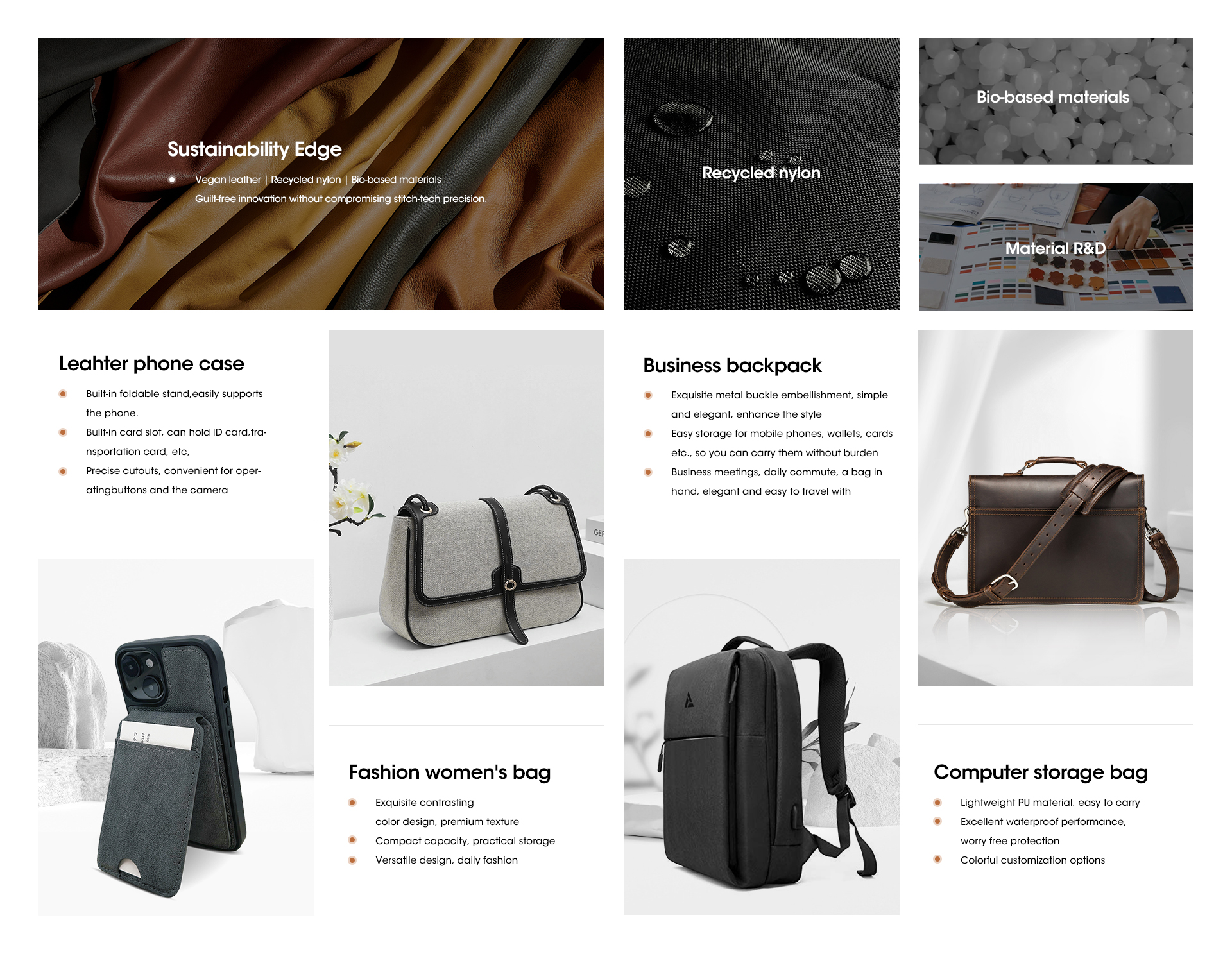 With 500+ OEM/ODM projects delivered annually, we specialize in precision-stitched tech accessories and cross-category bags, offering end-to-end customization from concept to market.